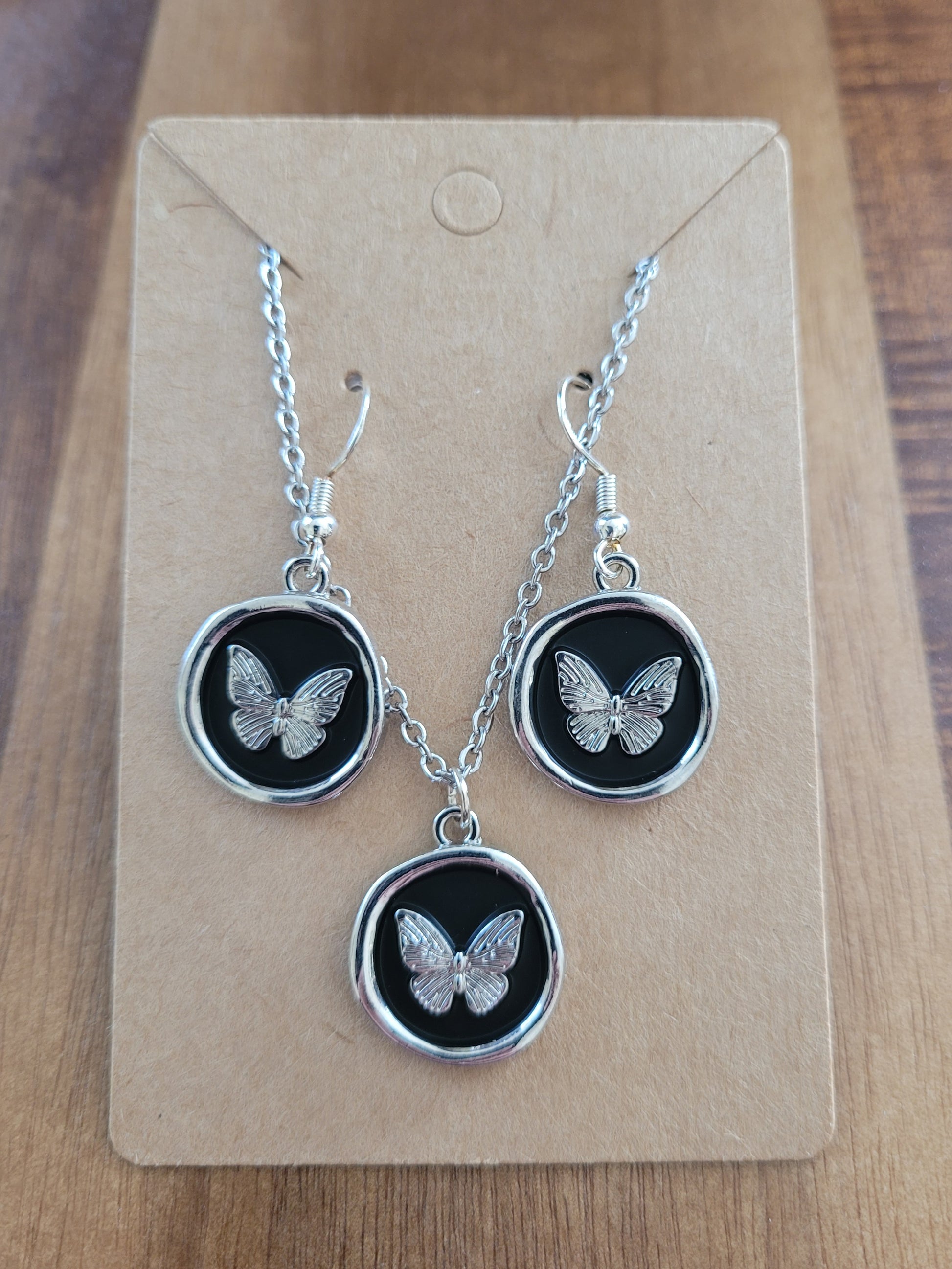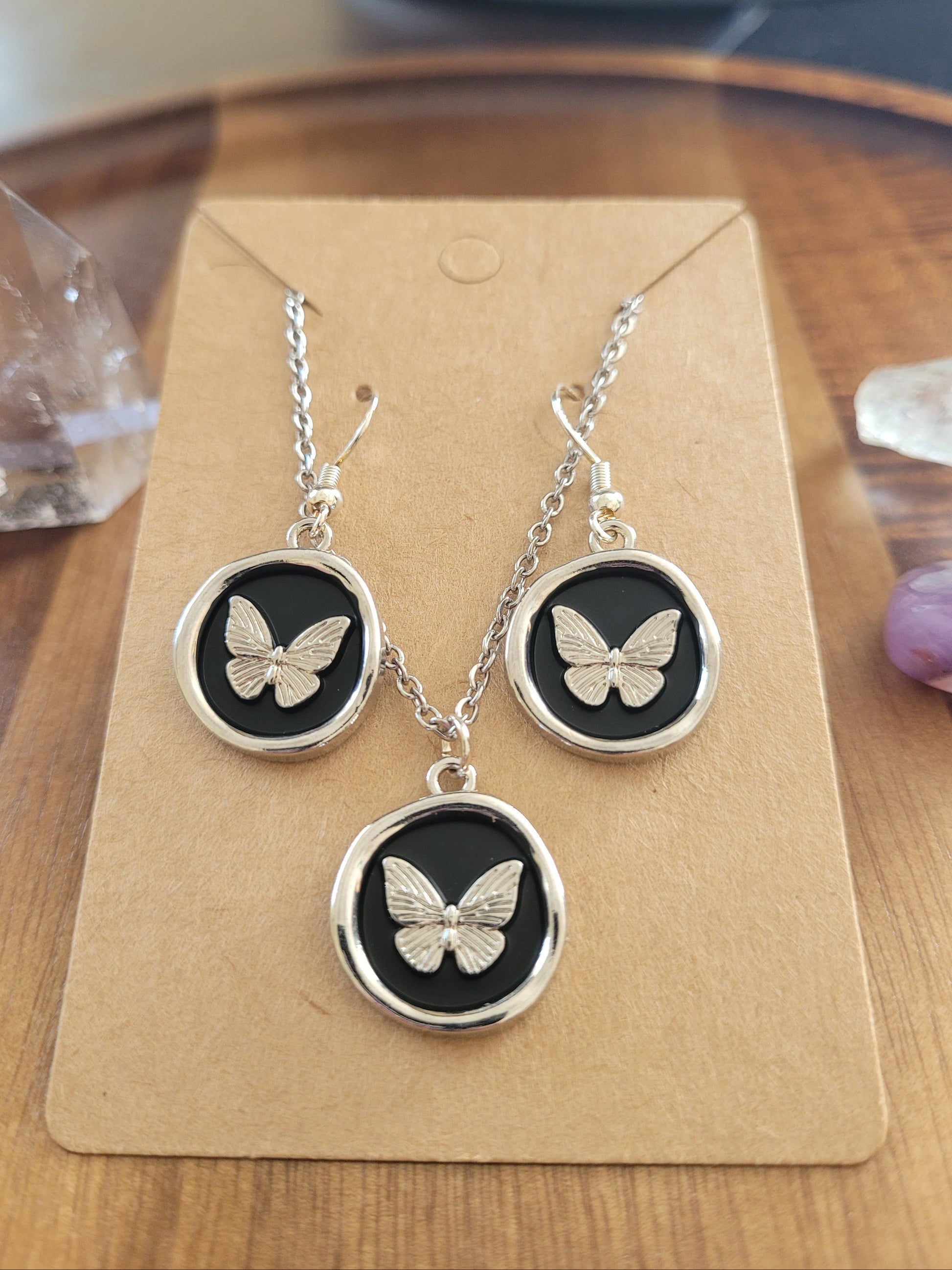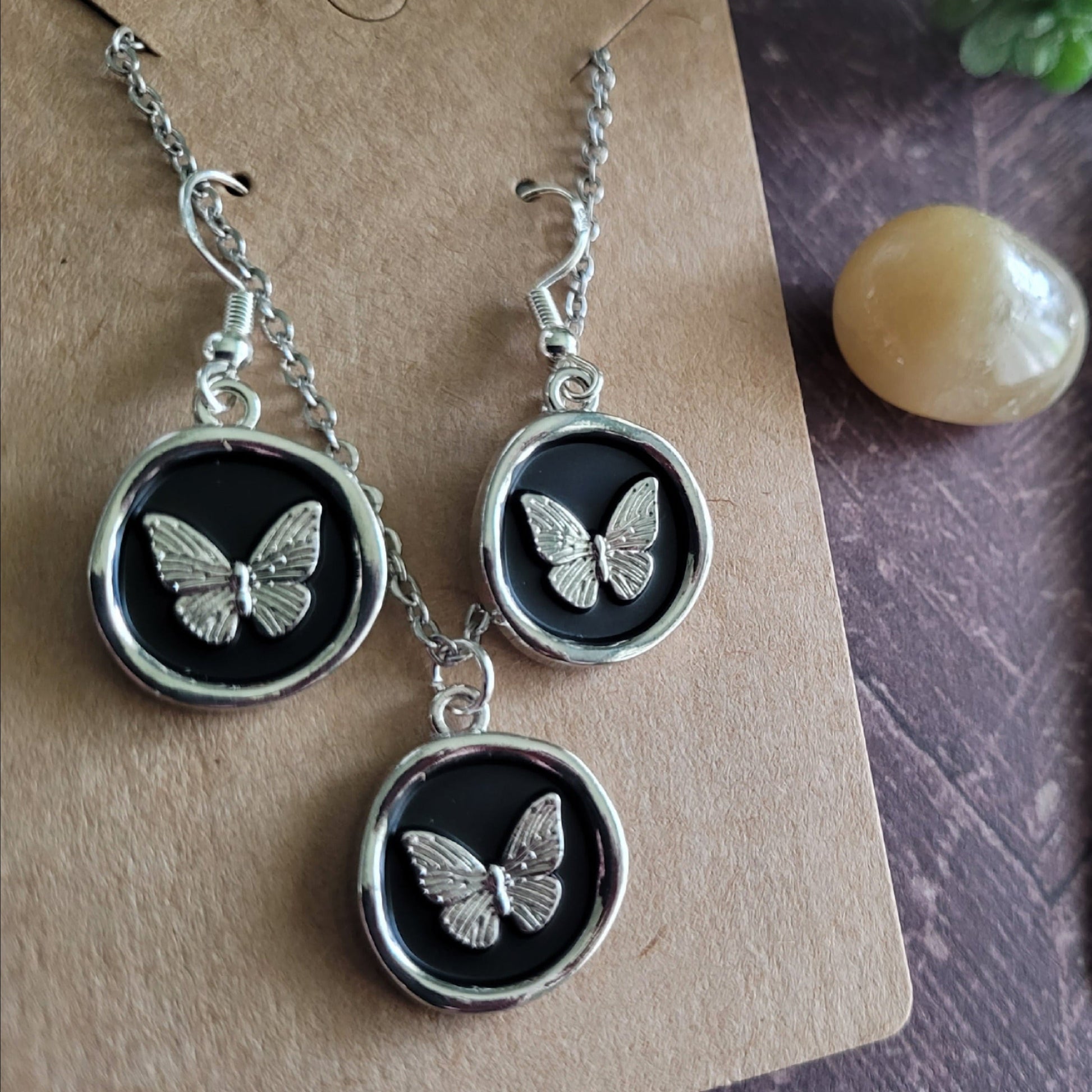 Earrings and Charm Necklace jewelry set. A detailed butterfly on black enamel, framed by a wax seal–shaped charm that evokes timeless romance and history.