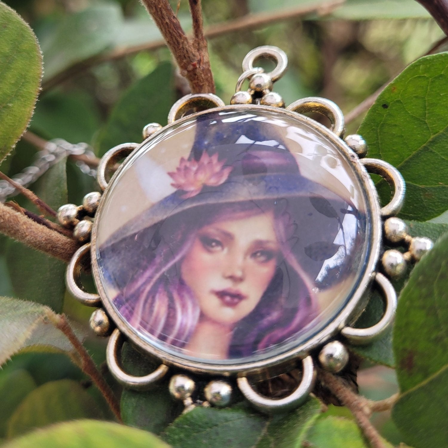 Glass cabochon pendant necklace with the image of "Lotus Bloom Witch" in an ornate tray.